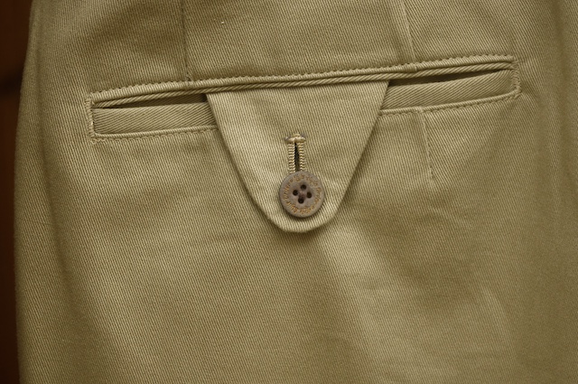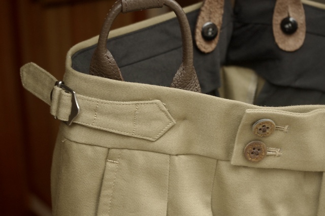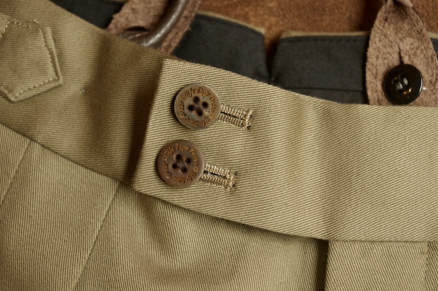 今回のカジュアルパンツはベルトレスのサスペンダー仕様ですので、ベルトを通すループが付いておらず変わりに帯上に尾錠ベルトを取り付けています。
