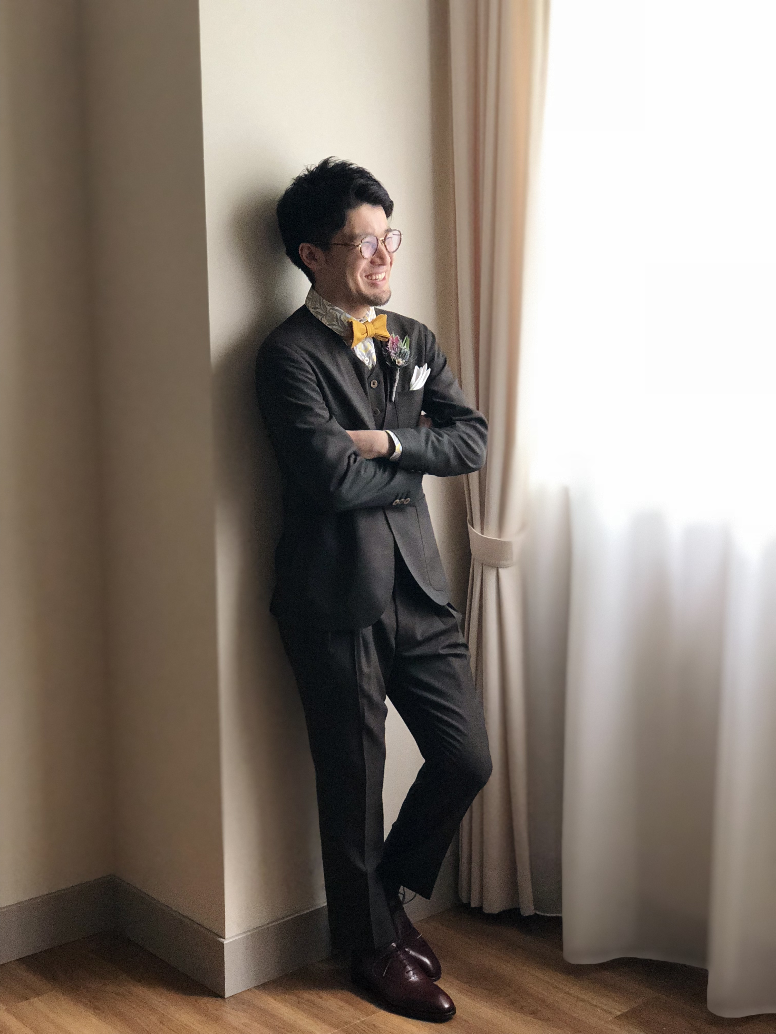 蝶ネクタイはシャツのカラーを取った、グリーンと相性の良いマスタードの蝶ネクタイを合わせました。