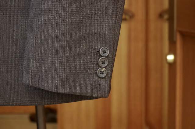 ボタンは生地に一番馴染む、本水牛の艶無しボタンより濃茶色を採用。