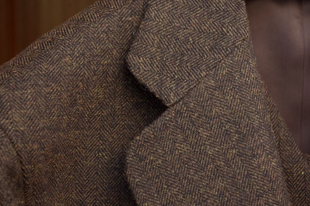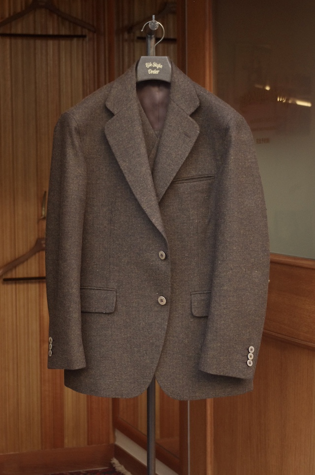 ブラウンのツイード素材を使用したスリーピーススーツです。