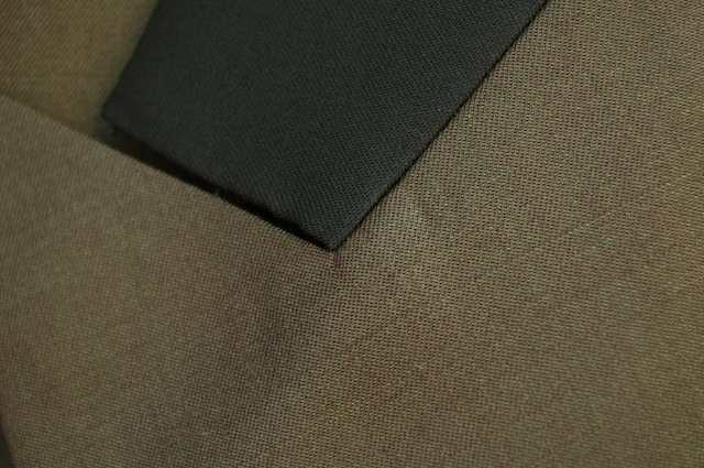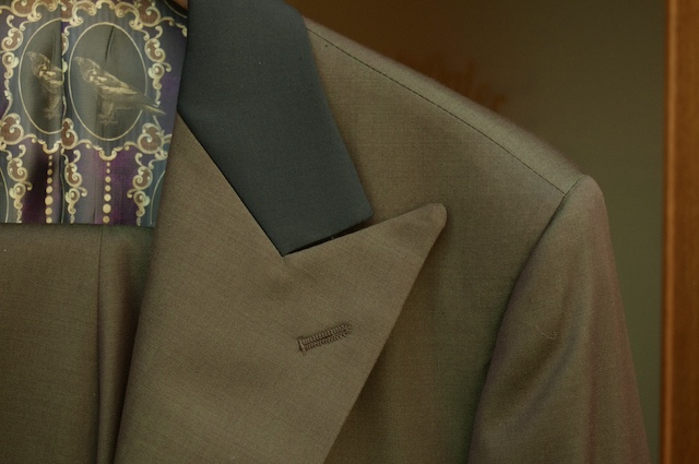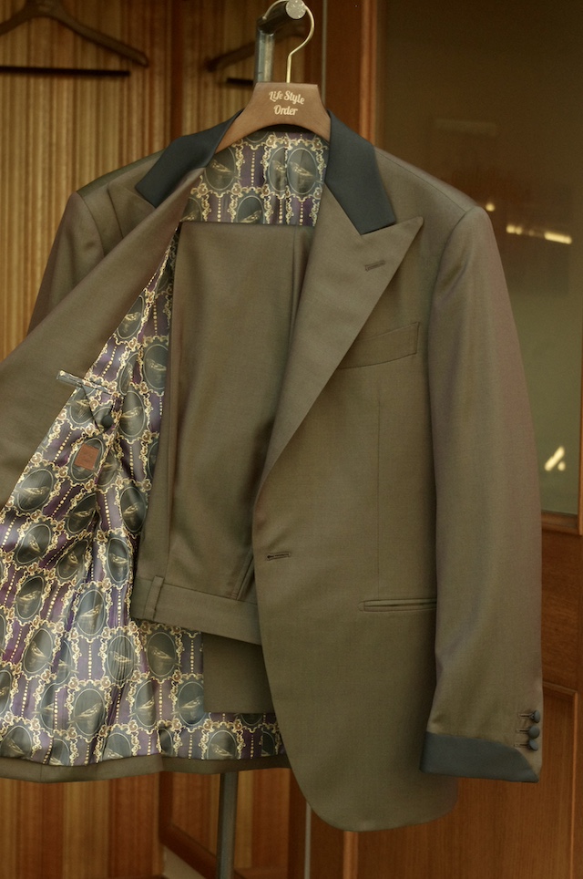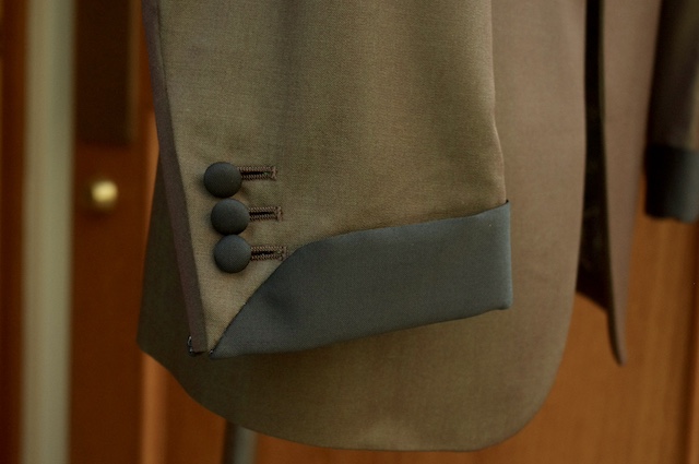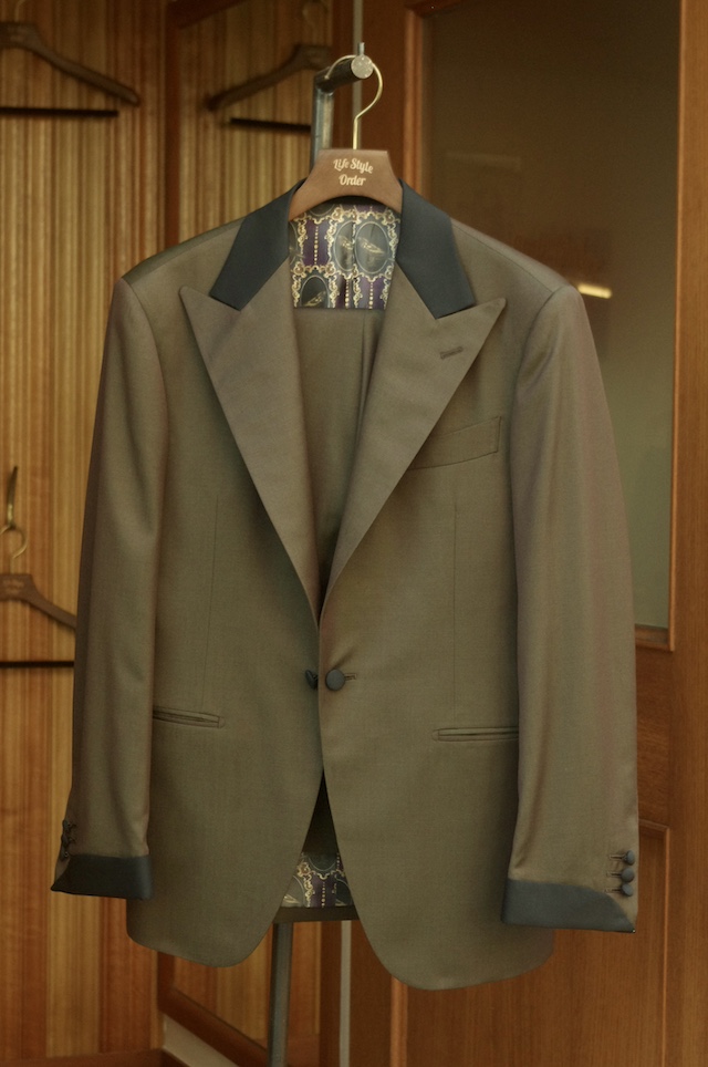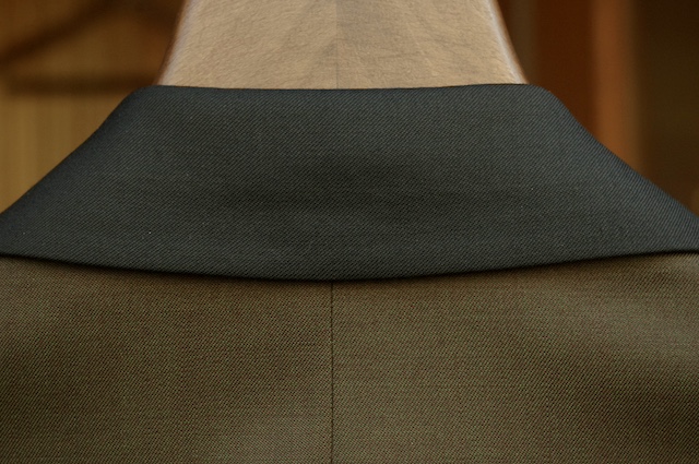 お気付きの方もいるかもしれませんが、正装のタキシードの場合は通常ラペルに拝絹と呼ばれるサテン素材を貼る事が一般的ですが今回は上衿のみ別生地を使用しつつ生地もウール素材を採用しています。