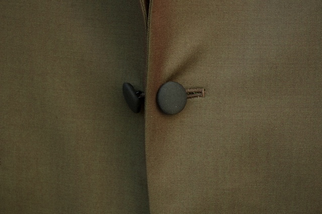 ボタンは上襟と合わせたクルミボタンで、タキシードライクな印象に仕上げています。