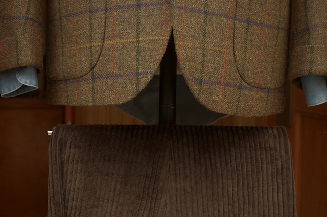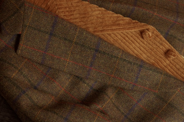 ツイードジャケットとコーデュロイベストの組み合わせ。