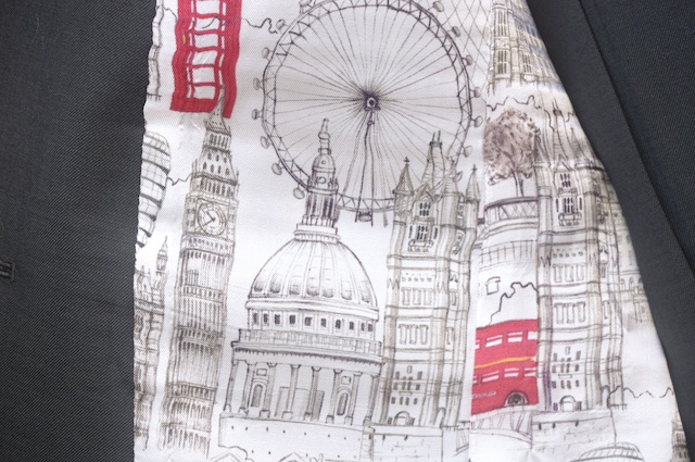 裏地はロンドンのモニュメントがアクセントカラーでプリントされた街の風景。