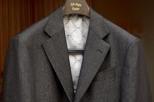 三つボタン、ノッチドラペル、水平フラップ、黒の水牛ボタンとスダンダードなデザインでお仕立てしました。