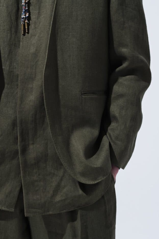 ノーカラージャケット、オーバーシャツ、タックパンツ全て共布で仕立てた、カジュアルなスリーピーススタイルの新郎衣装です。