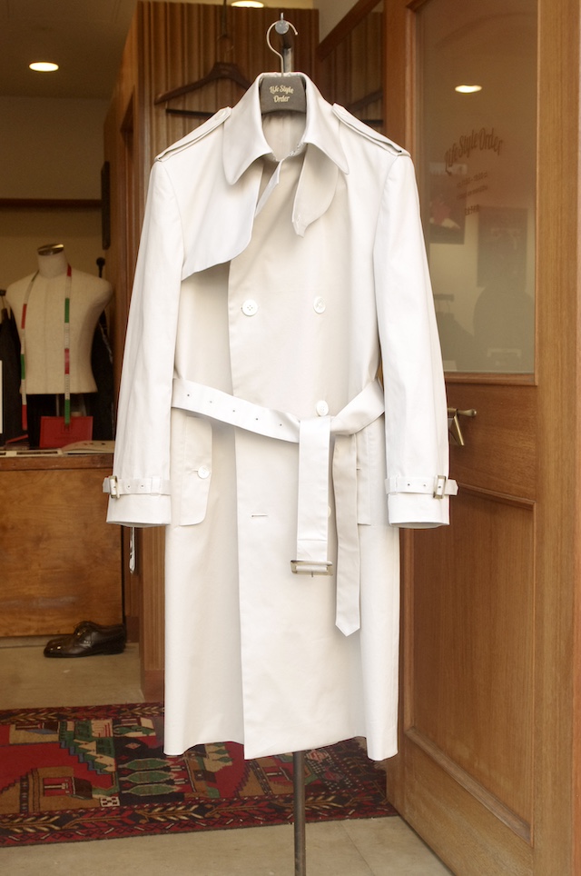 今回は、皆さんに認知されている一般的なベージュカラーより明るい色で、襟の高いトレンチコートが欲しいと言うお客様よりオーダー頂きましたのでご紹介したいと思います。